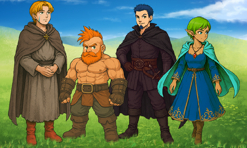 Quatro heróis jogáveis: o Clérigo, o Guerreiro, a Maga e o Ladino, cada um com habilidades, estilos e histórico.